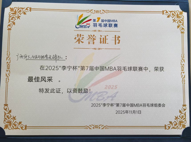 11月1日-2日,由厦门大学主办的2025年第七届全国MBA羽毛球联赛圆满落幕。我校组建的“广西师大MBA独秀先锋队”不负众望,在赛场上奋勇拼搏,实现了从往届乙组到本届甲组质的飞跃,用汗水与实力为学校赢得了荣誉!
